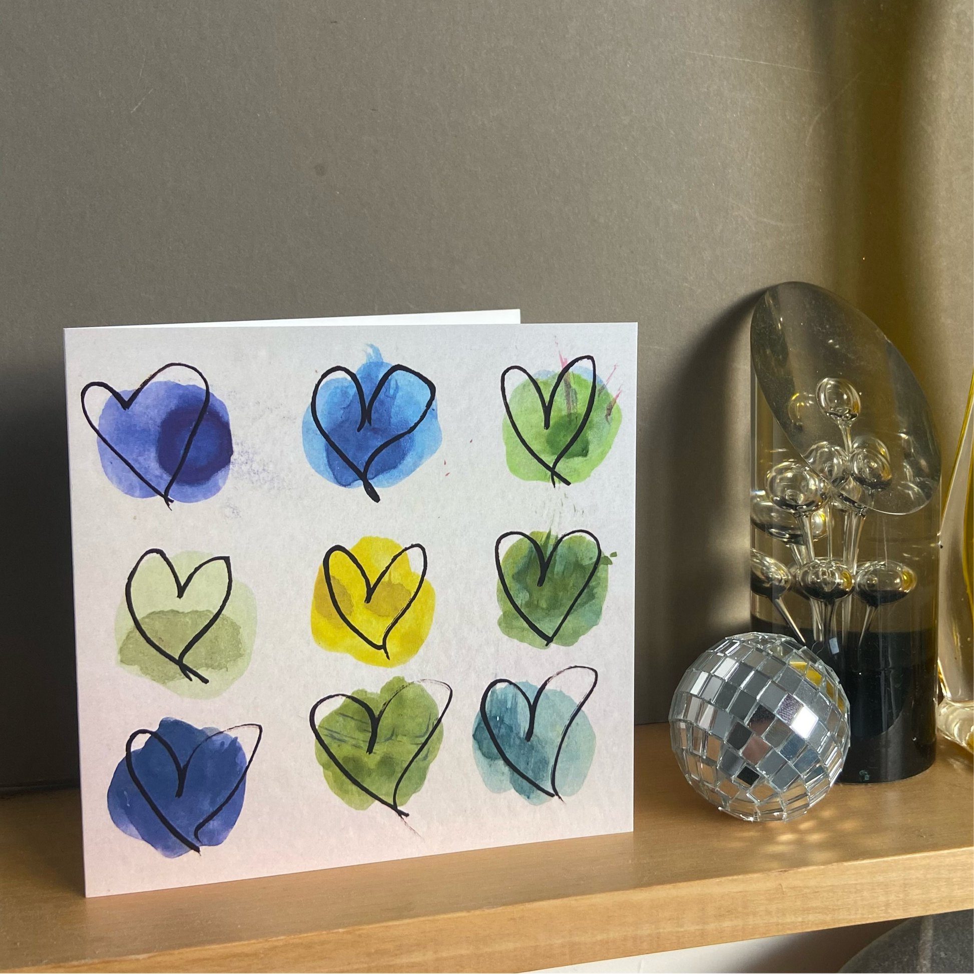 Beautiful shades of green and blue, reminiscent of hues and tones you’ll find in the garden. This card is taken from a small painting I did with pen heart detailing. I love painting hearts, they make me happy.