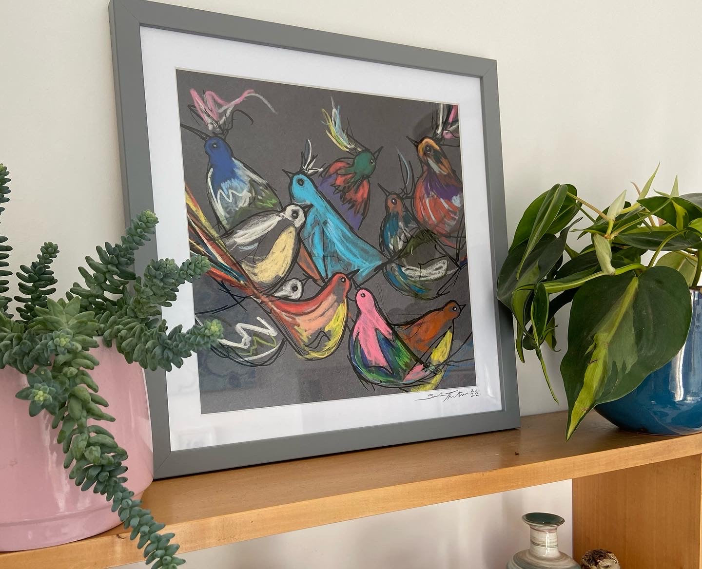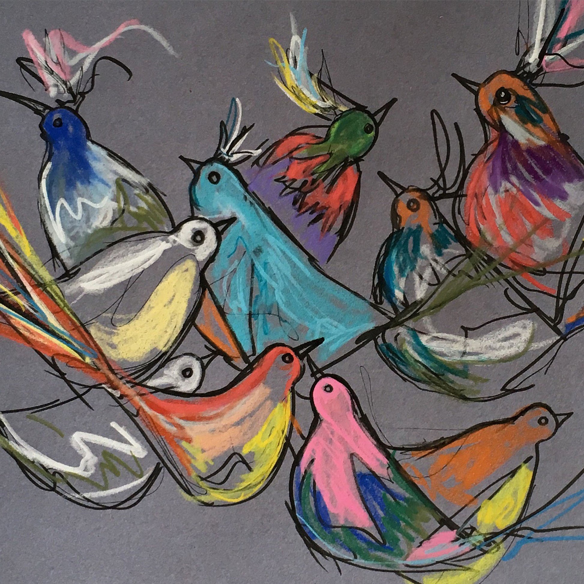 It's a dull rainy day in the North of England, but inside my studio a tin of bright wax pastels calls to me, time to get the party birds out and remind yourself that the rain will stop and what's more it's needed, it can't be sunny all the time can it?