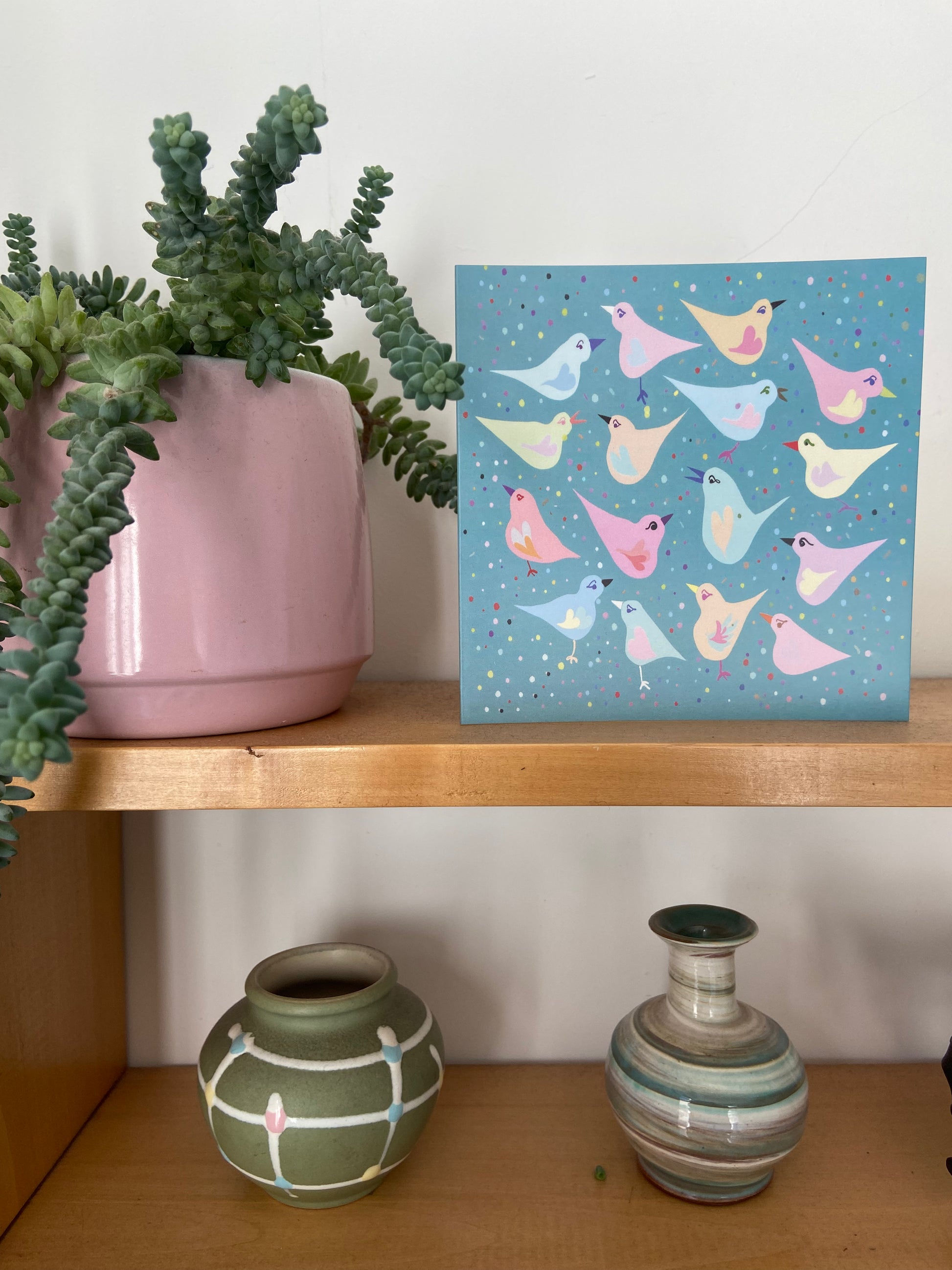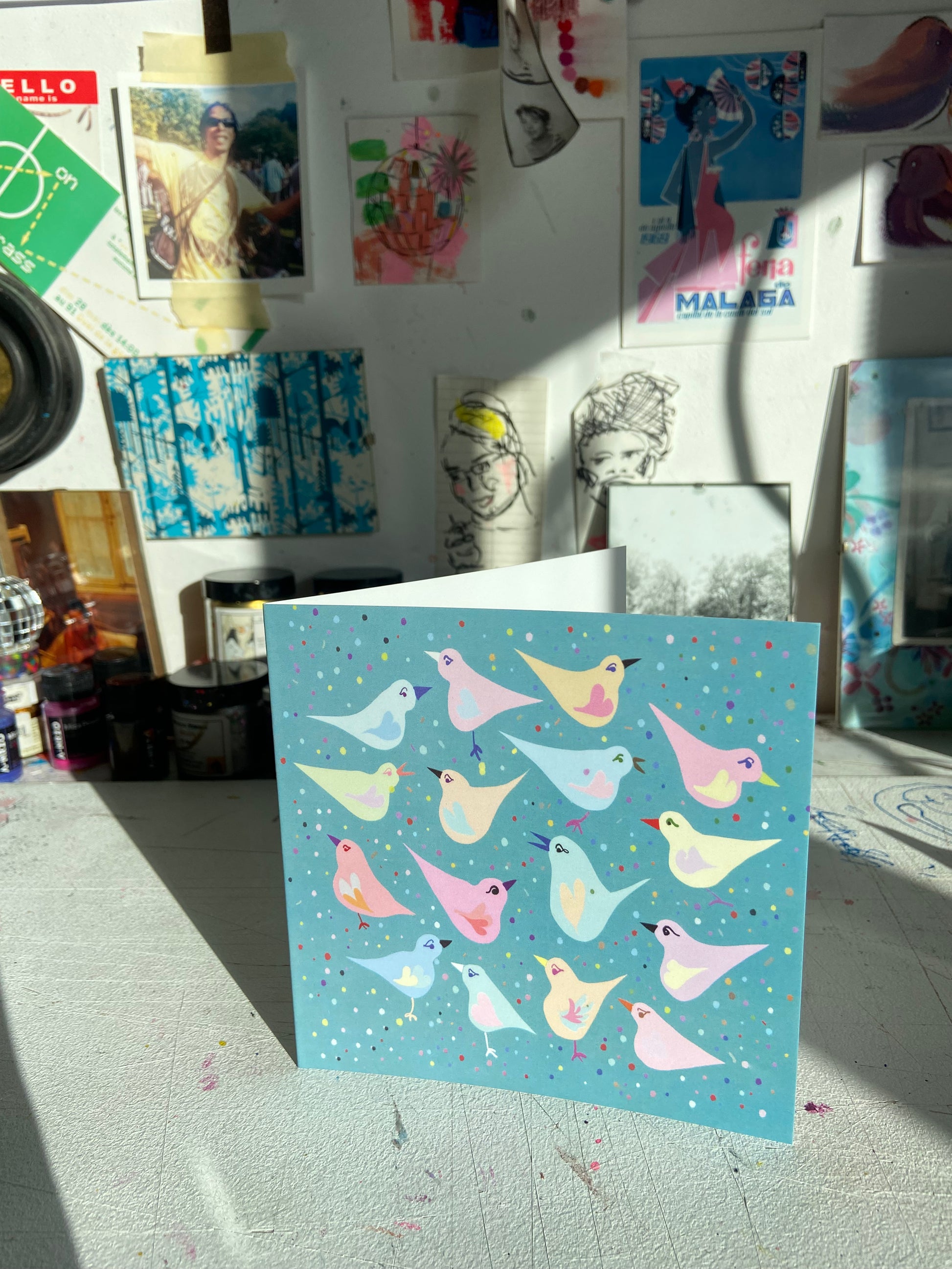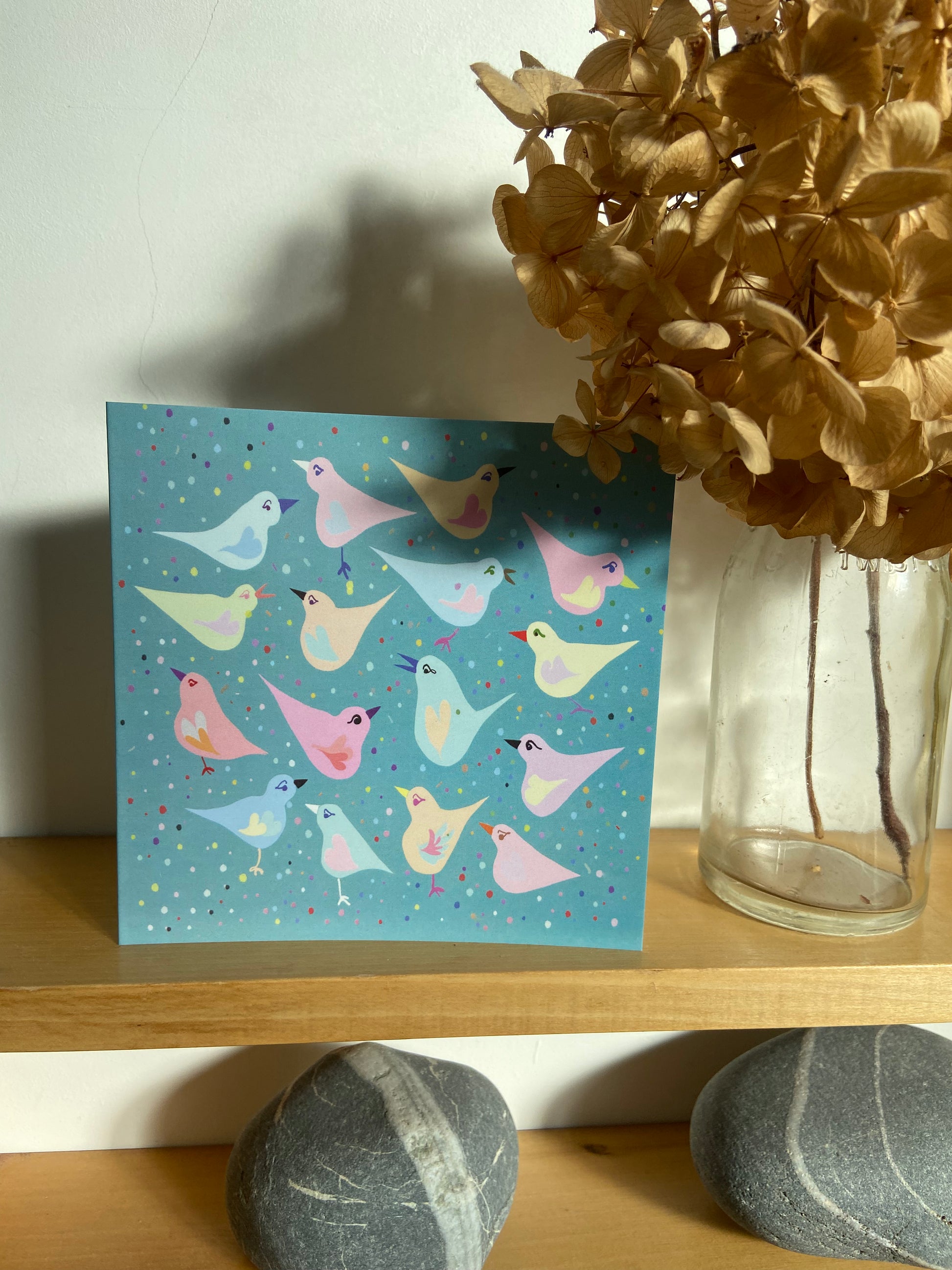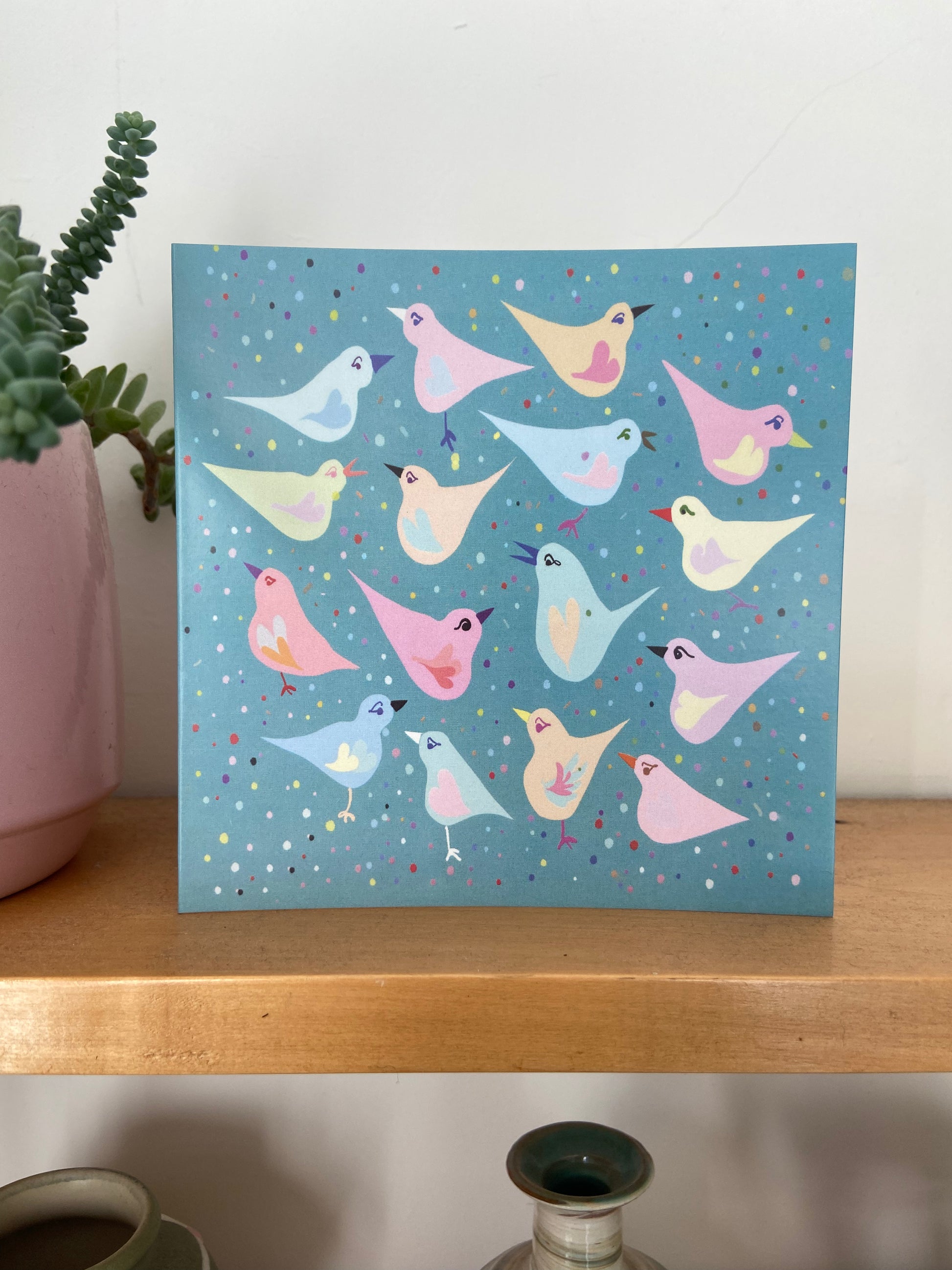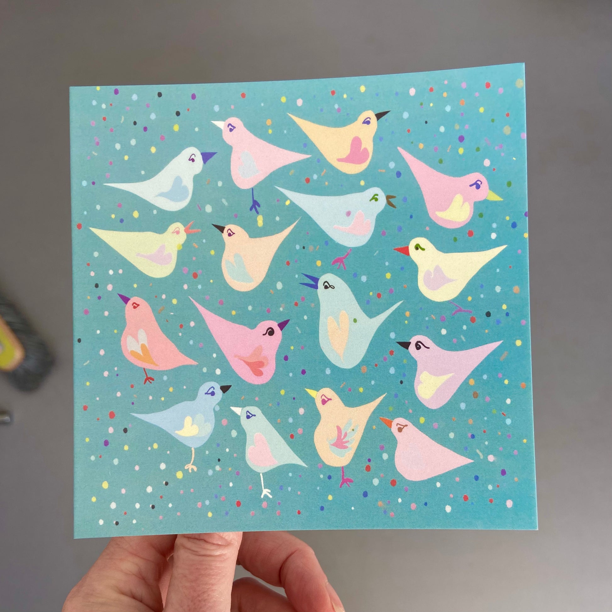 Little dotted lovebirds, a whole flock of them happily pecking up confetti colours to send out loving vibes to whoever needs them.