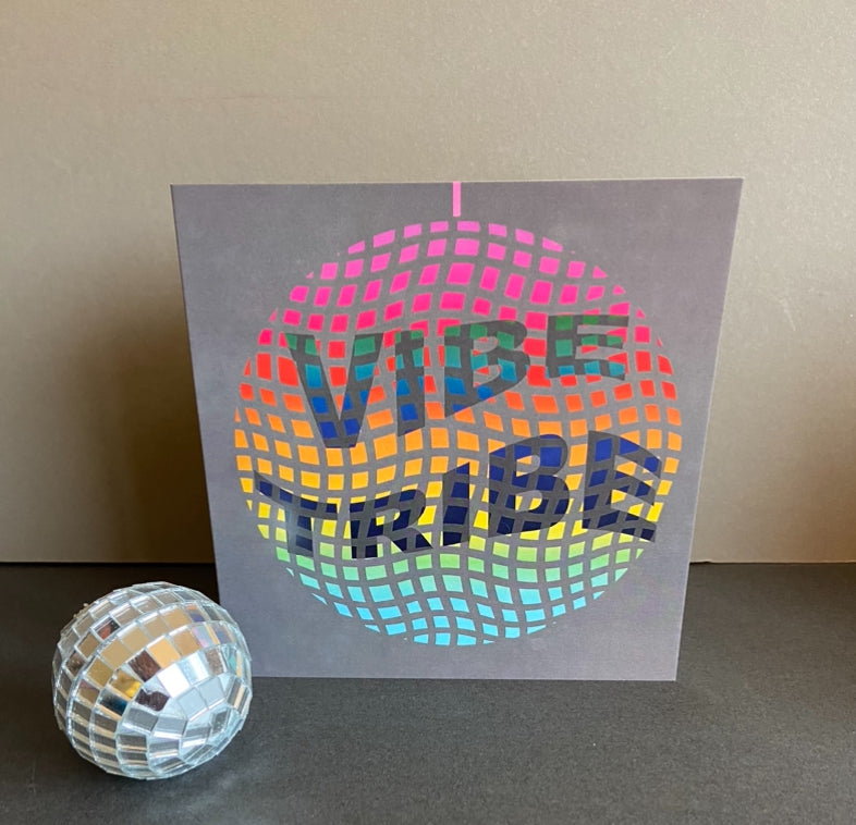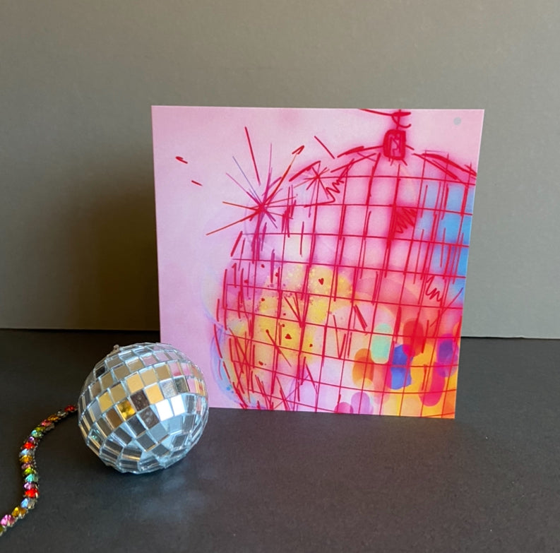 Set of five limited edition themed discoball art cards, blank on the inside for your special words. Comes with an extra card FREE! Printed here in Leeds, supporting another small independent business. Size 13.5 x 13.5cm