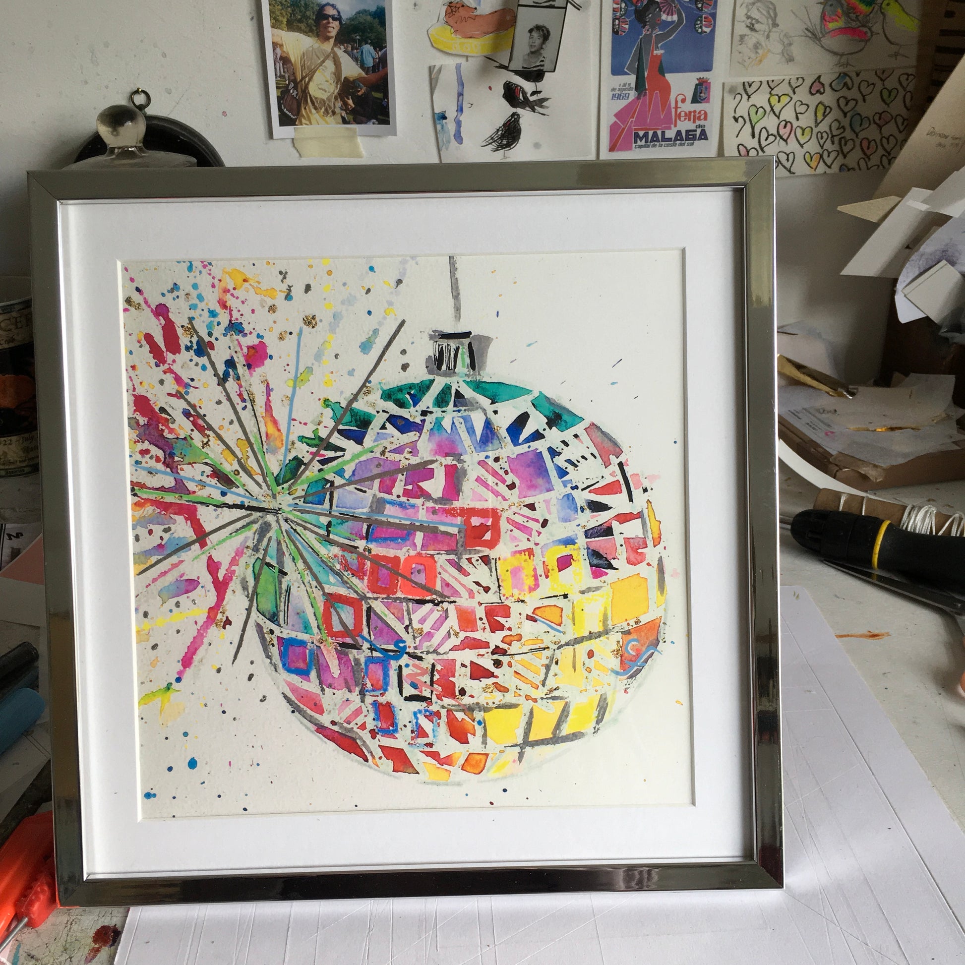 I tried out a new technique with this one, painting with liquid wax to build the discoball shape and then overpainting with highly pigmented German watercolour. The original has spun it's way to Pittsburgh U.S.A. The prints look fabulous with a generous sprinkle of sparkle curtesy of my gold leaf flake collection.