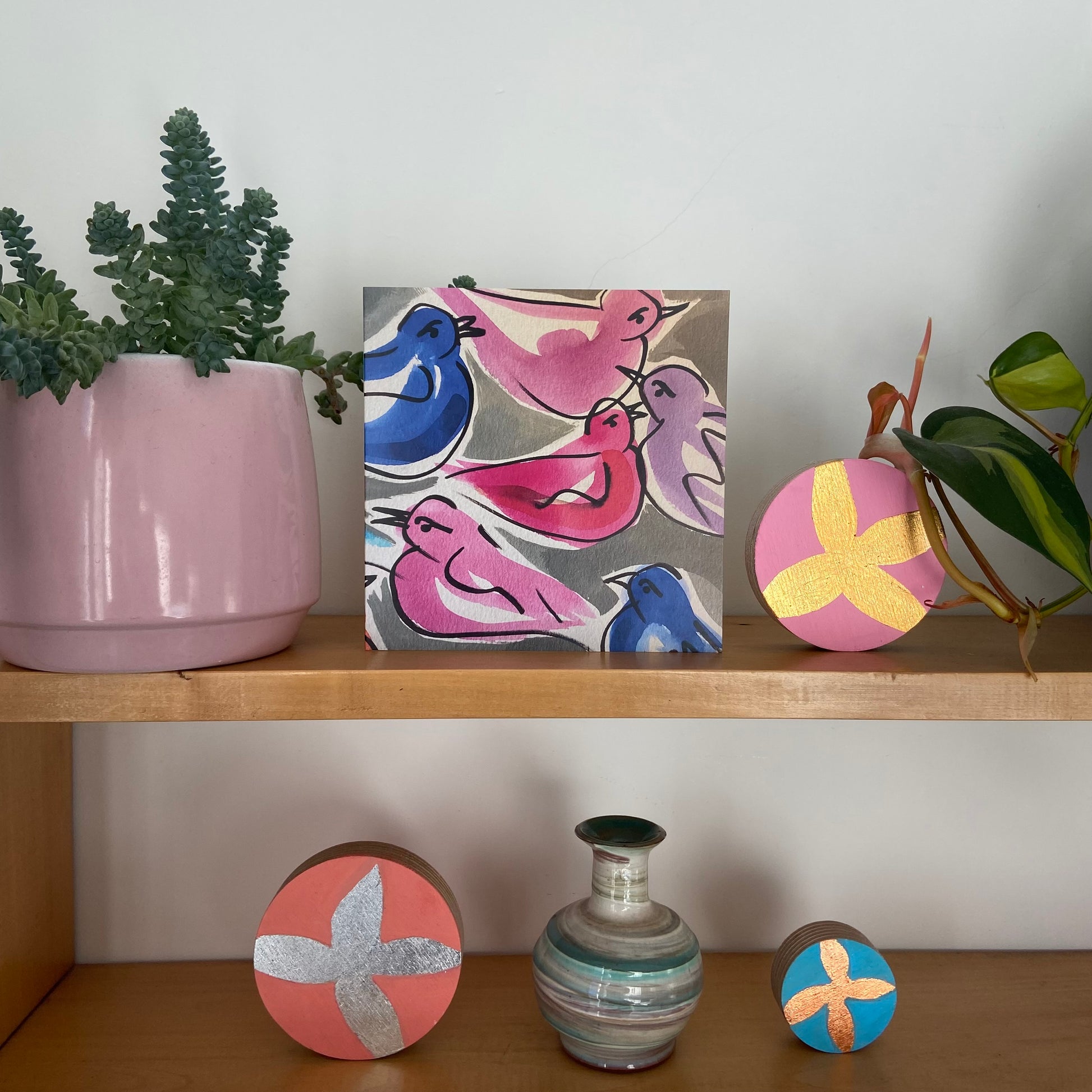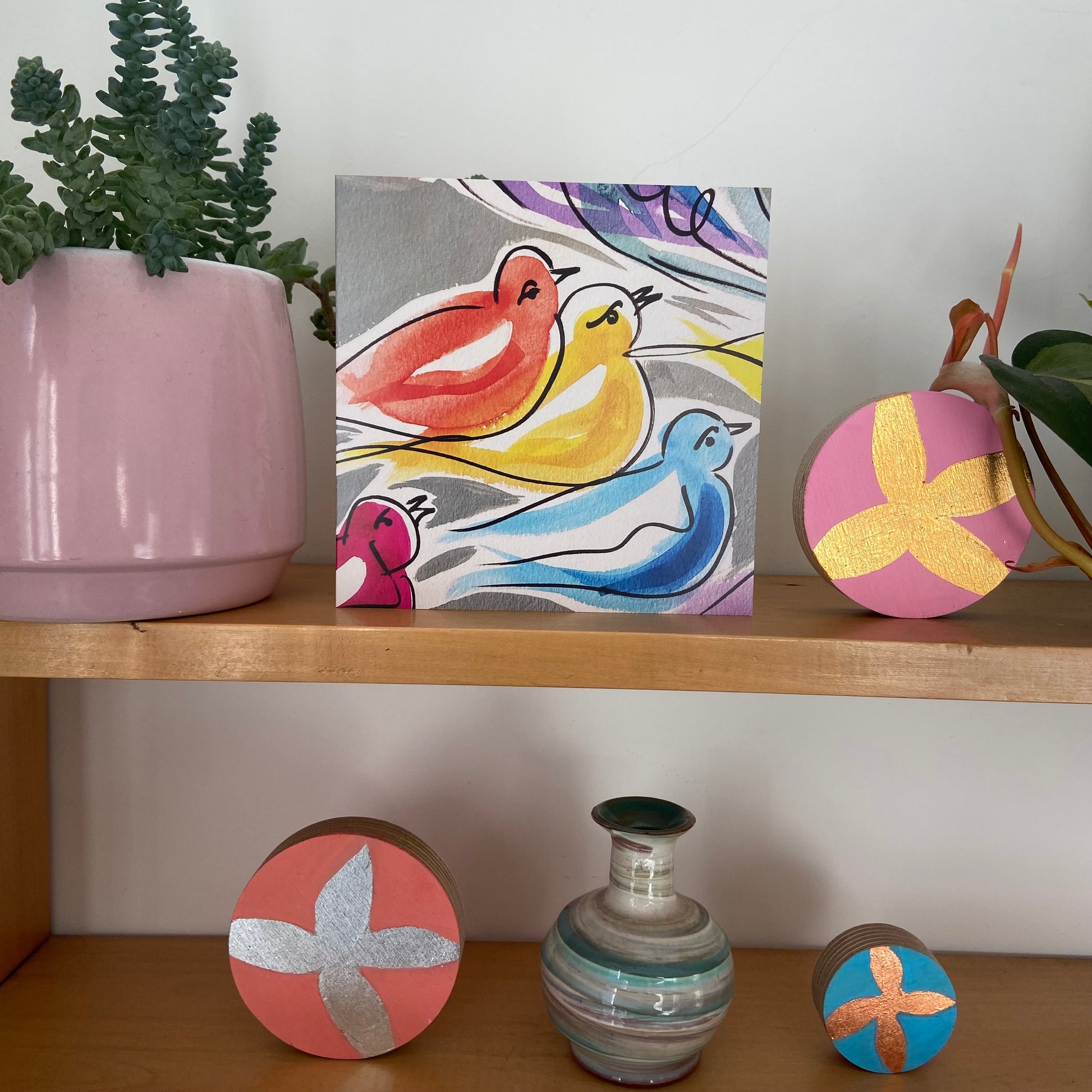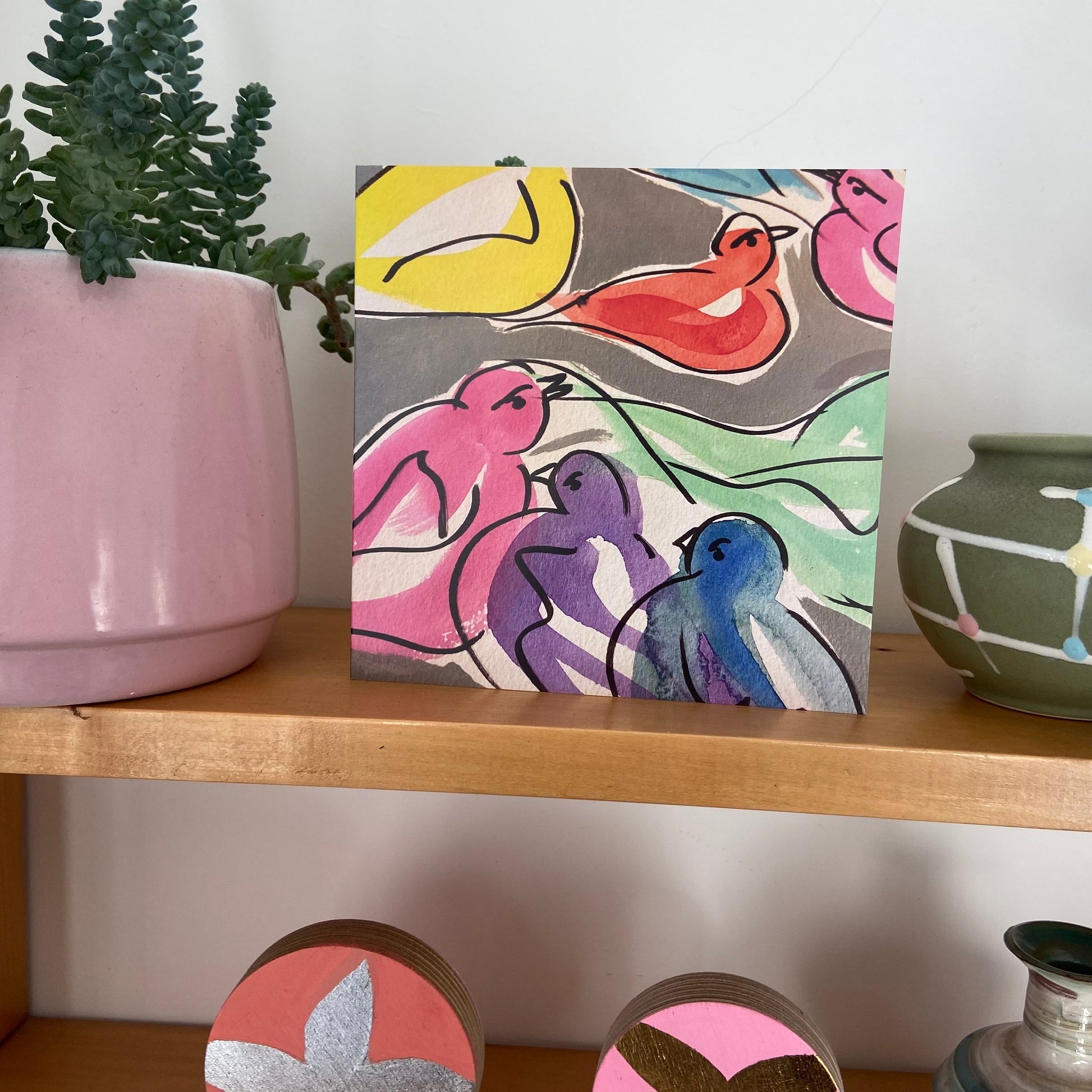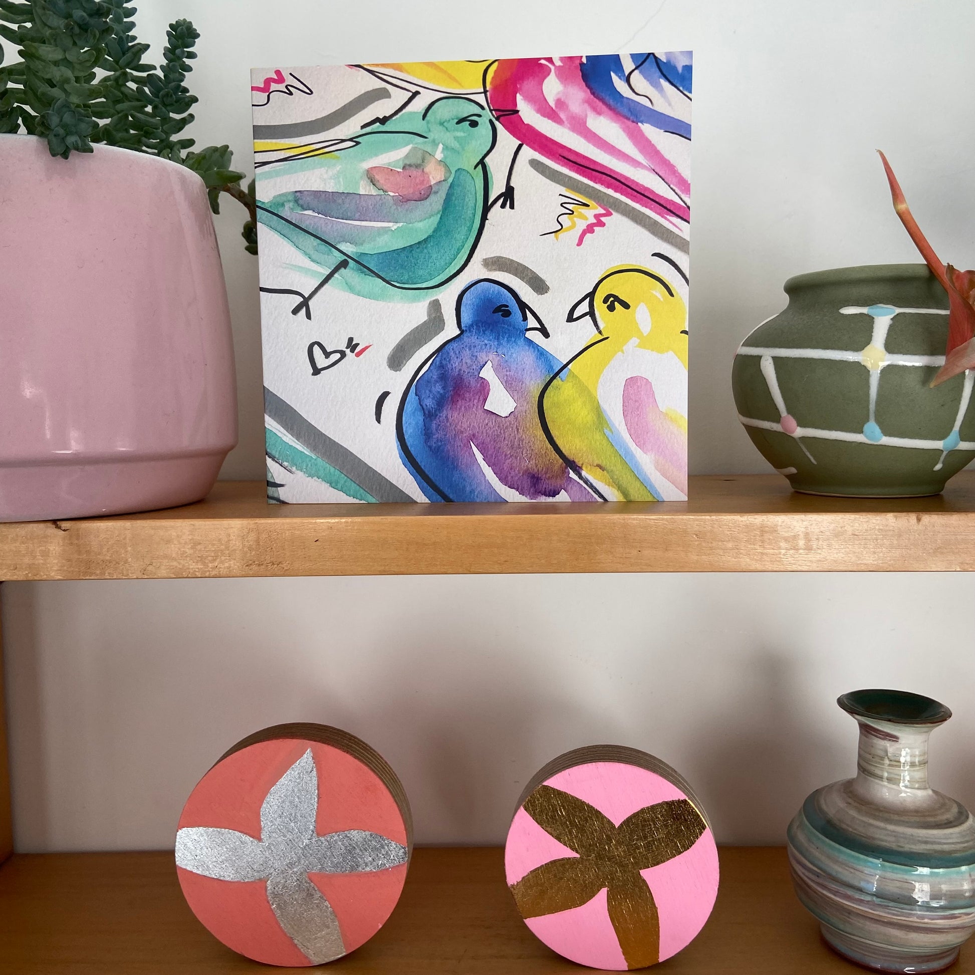 Set of four limited edition lovely bird cards taken from my original watercolour and ink painting. A flocking bright collection of fantasy birds to cheer you on, painted with love. Blank on the inside for your special words.