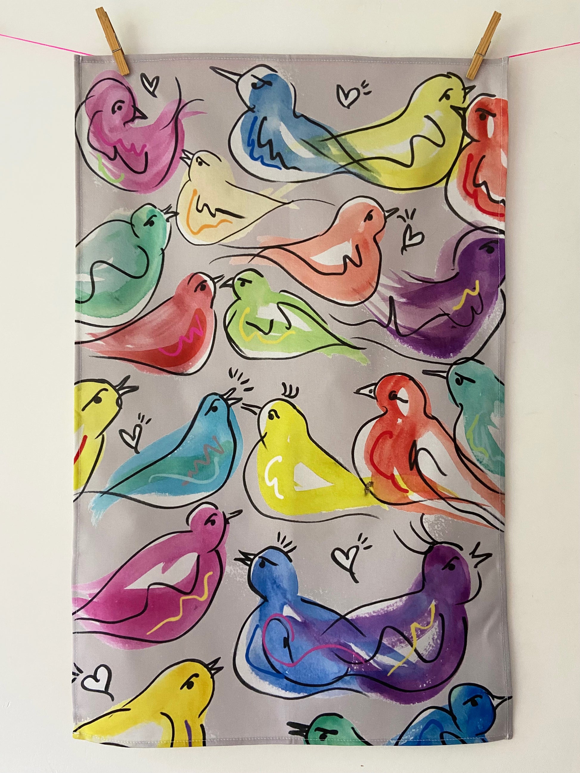 I like to explore our very human emotions through my birds and this flock of lovebirds is about joy and good times with people who make you feel nurtured.